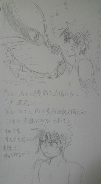 飽きる様子がないっていうか、考えれば考えるほどゴールが遠い気がする。 絵ネームが4p超える・・・・。4pもあったらもうできそうなのにな。(おいおい出す) メンマとイルカ、サスケと熱血カカシの関係は固まりつつある。 メンマと黒クラマ クラマたんもっと大きいだろうけど; メンマはあれだけ周りに愛されてて、力もあるのに、憎しみを秘めてるのが黒クラマたんにとっては興味深いのです。 メンマと黒クラマは相思相愛かも。 メンマはずっと封印されてた黒クラマに少し同情しているし 黒クラマはメンマをのっとることよりメンマを通して人間を見る方が楽しい感じかもしれない。 周りの人間はそうは思ってないしメンマごと里の爆弾で兵器だけどね。つらい。 何故メンマがこんな風に考えるようになったかがまだ説得力ある理由が思いつかないんだよ。 (RTNはナルトが来たからメンマの性格が歪んだわけではなく、元々見栄っ張りだったという妄想設定にしてる) もー誰か一緒に考えてよ。 メンマはミナクシのこと好きだけど、嫌いっていうか・・・。 そうなった理由が話のメインじゃないとしても考えておきたい。 人間のもつ嫉妬や憎しみも 愛から生まれているから、喜びにも変わることだってあるよ。 サスケはメンマを好きになって変わるんだよ。 メンマは、自分を好きになって変わろうとしているサスケを見て、変わるんだよ。 問題はその過程がね・・・・・段階がもうちょっとね。 毎日考えてるよマジで。 「僕らは~」の音長サスケもすげえ考えたなあ(;´∀`)懐かしくてまた読み返してた。 セリフばっかですかすかだけど好きだなあ。もとこんの挿絵でウハウハする。状態2サスケうははvv ネタが浮かべば状態2Hまた書きたいものです。 |