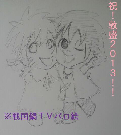途中で飽きたwww これは信蘭っていうか戦/国/鍋TVの絵のパロだけども (公式サイトの富士ロックのマナービデオより) こういう歌詞があるんだよ。(ちょっと変えてますが) なんとなく歴史が学べる番組 戦/国/鍋TVっていう番組があってだな・・ 簡単に言うと歴史の人物を役者が演じて面白く歴史をなんとなく学べるやつで そのコーナーの一つに 織田信長と蘭丸がユニットを組んで歌って踊ってるやつがあってだな・・・ それがすごくラブラブなんだよ!! あと踊りがすごいんだよ!それが「敦盛2011」っていう曲で、 いつかチャラメンで描くぞーって(´∀`)って思ってたら 敦盛2013という新曲が出ましたwwww おっふwww 新曲のPVは 公式サイトで 27日末まで期間限定で公開してます。 ぜひ見てみるといい。そして私と信蘭の話しよう。 演技力ってすごいな・・うっとり。あとAKR47もいいと思う。 AKR47を木の葉男子で誰か描いてくれないかな・・・・チラチラッ ていうかそろそろサイトのTOP絵変えたくて!! けーさんの絵にいつまでも甘えてはいけないと思いつつ完成された絵がない;;; サスナルコ続きはいつ出るのか;;;今すぐは気乗りしなくてだな;;;メンタル回復しねーと書けない(1冊で完結できなかった自分にまだショック受けてるんだよ;;;) な、夏・・・?10月・・?;;;夏でまだ売り切れないよね;;;2出す前に1がなくなっては・・・まずいっすよね・・・? (過去出した義兄弟SNで前例あり) 義兄弟SNも久しぶりに読み返したら小説の雑さにぞっとした(llll´Д`)ひぃ 今後もっと頑張ってかくよ。 続きは拍手返信です 拍手だけの人もありがとうございます*^^*