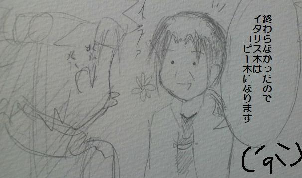「うちはの嫁!」東4 きー22a 新刊 サスナル 【僕らはいつでも恋をする 総集編】 18禁 パラレル小説 新書サイズ 188P 800円 表紙&挿絵 カケタ素子様 内容解説&サンプル サスナルコピー本【タイトル未定】 18禁 パラレル小説 A5 12Pぐらい? 無料配布か100円 人間サスケ×妖精ナルト。ネバーランド的な平和な島に住んでるナルト。大好きなご主人サクラと楽しい日々を送っていたところ、ある日サクラの天敵のサスケに拉致されて、あんなことやこんなことをされる。 (・・・・っていう話が大分前から書きたくて今頑張ってる。 出なかったらすみません。サンプルすらあげられない状況) イタサスコピー本【兄さんは火影様!~色任務編(仮)】 18禁 パラレル小説 A5 28Pくらい? 200~300円 内容解説&サンプル あとはオフラインどおりの既刊持って行きます(なっち1も)。弱ペダとカカイル本は持って行きません。 とり置きも受け付けますぜー。前日まで拍手かメールで確保してほしい本を教えてくださいな。 新刊「僕らの~」はまず売り切れる量ではないですが、他新刊はわかりません。というか発行できてるのかな;; 宇佐美とカケタ素子さんがいます。 でも開始30分は二人ともいないかも。そして宇佐美は午後になるまであまりいないかもしれません。いたりいなかったり。今からスペースにちゃんといる姿が想像できない。ごめん。本当にうちは兄弟本がハンティングしたいんだ。 うちは祭り景品交換時間(12時30分~)は確実にいないです。 うちは兄弟祭とSNラブファイターズに参加していますが、シールラリーにはどちらのプチにも参加してませんのでシール配布はないです。ごめんよ!!(´;ω;`) いっぱい伝えたいことあるのですが・・・今すでに瀕死です(lll´∀`)へへっ 夏の本の告知とか、サイト再録とか色々したいことたくさんだぜ・・・・ イタサス本せっせとやってたんですが・・・ 終わらないし、出来に納得いかないし、表紙も気に入らないし、あとエロもないし オフ本にすると高くなるのに、金額に中身が見合うとは思えない。 という考えが渦巻いてやる気もなくすし、 結局原稿終わらねーし・・・ のでコピー本にすることにしました(´ノω;`)うううう・・ ダッセーな宇佐美 イメージ絵公開に日記やツイッターに愚痴に、友達に途中まで見てもらうまでしておいて、できないってのは珍しいなあ。できないっていうか気に入らなかっただけなんだけど。 前半ギャグなのに後半からややシリアスでなんかこう・・・温度差があってだな。 今日終わらせて明日中身コピーして表紙作るかと思うのだが・・お、終わんない・・・気にいらないよおおお(´;ω;`) 後半まるまる書き直すか、ネタ自体を変えるか。(´;ω;`)(´;ω;`) (´;ω;`) 苦しい。 |
