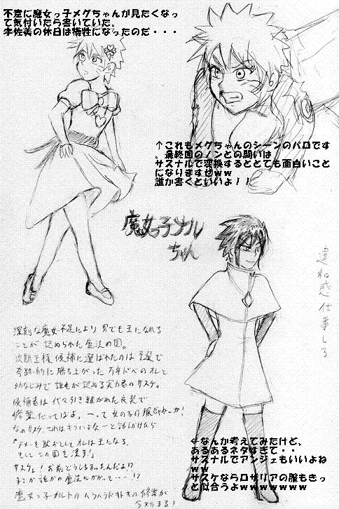 5月怖いよう・・・でも人の本は楽しみだ。 明日こそ頑張る。 あ、スペースNOは きー22a で サスナルスペースね。 今日はこんなことしてた・・・・・orz 現実逃避ェ ジャンプの感想描いてて(続きにしまってます)、ふと今さらながらサスケの目の中に☆って魔法少女のようだなあと思って・・・・・ メグちゃんパロ絵描いてた・・・ 本当はあと3枚ぐらい描いてるけど面倒なのでうpしない。 ノンちゃんが魔法で鷹を召喚して、乗ってたwwwサスケ変換できるwww サスケ&ナルト女装絵注意!↓ サスケの女装はめっちゃ好きだな・・・・ただし攻サスケに限る。 女装攻めサスケがナルトを押し倒すのがいいのだ。 受ナルトが女装可愛いのは当たり前だけど、攻サスケは不自然なはずなのになぜか似合っているというのがたまらないのだ。腕とかちょっとごついといいよ!!! そろそろ女装攻めサスケアンソロとか出てもいいはずだ・・・だれか・・だれか・・・! カカイルではJKアンソロあったのに・・・!!(カカイルも萌えたけどサスナルも誰かくれよ!) メイドとセーラーとブレザーと着物とーOLと、あと何がありますかね?あ、ナースとスッチーですねwww うわー・・・キモイ☆(*´q`)キモイねwwwww いやサスケ愛してますよ!!!!!!!!!!!!!!こういう愛し方しかできないんだよ!! サスケ弄り隊。 メールやメッセージありがとうございます(´;ω;`) 嬉しいです。せっせと通販作業も進めさせていただきますね。 ジャンプのネタバレ感想絵は続きに。 ネタバレ・・・? というか雑すぎてどのシーンかわかりずらいと思います。 サスケェ・・・・ PR